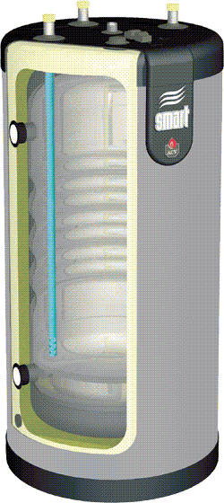 A melegvíz tárolót két koncentrikus tartály alkotja. A belső használati víz tartály rozsdamentes acélból készül, amelyet kívülről körbeölel a fűtővíz. Így ennek a tartálynak a teljes felülete a hátadó felület, ami 1,5-2,5-szer nagyobb mint egy hagyományos csőkígyós vízmelegítő esetén, ezáltal a tartály rendkívül rövid idő alatt tud nagy mennyiségű melegvizet biztosítani. A magas hőmérsékleten tárolt víznek köszönhetően kisebb tartály térfogatra van szükség, miáltal csökken a tartály hővesztesége és helyszükséglete.