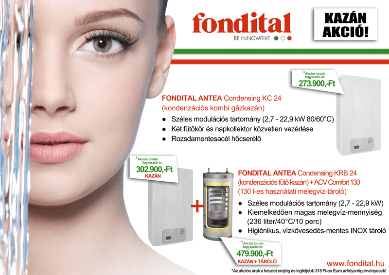 Örömmel értesítjük látogatóinkat, hogy 2017-ben tovább folytatódik a Fondital kondenzációs gázkazán akció. Az Antea Condensing, elektronikus szivattyúval felszerelt kombi, valamint fűtő kondenzációs készülékekre vonatkozó ajánlat visszavonásig és legfeljebb 315 Ft-os Euro árfolyamig érvényes.
